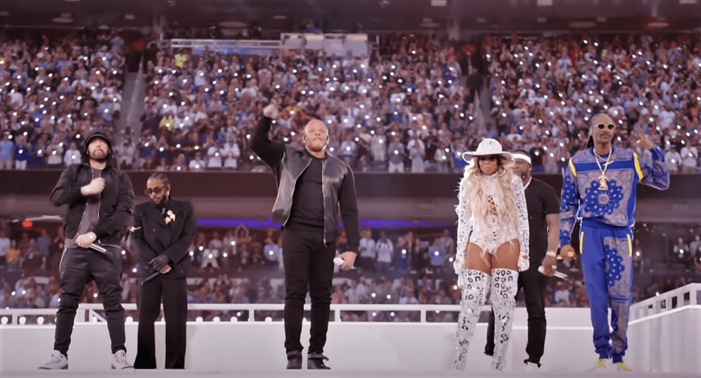 That was a huge party y’all. A huge party with only hits delivered, all smiles from everyone in there and memorable performances. This year’s Halftime Show was what hip-hop is all about and it was held on a Compton town map. That was music history on NFL, not just a show to have fun. It was a music history party lesson , full of hip-hop.